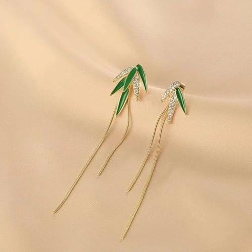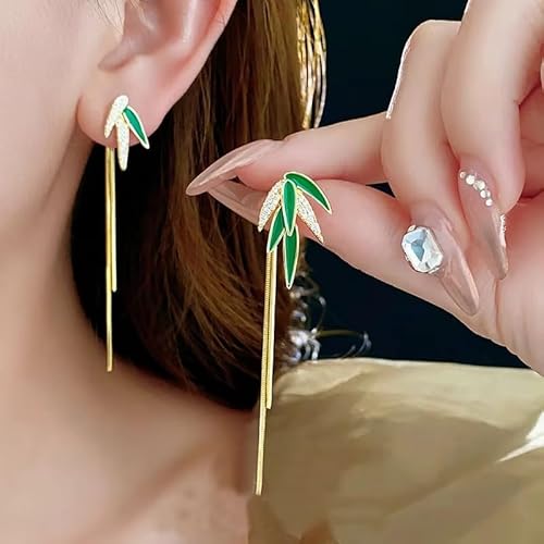 Green Leaf Bamboo Tassel Long Earrings, Long Lightweight Fashion Jewellery, Nature-Inspired Design