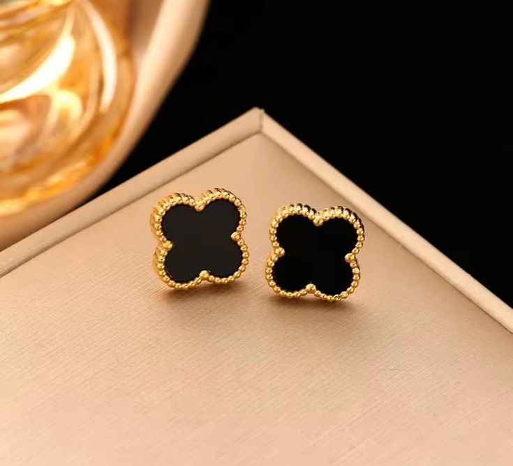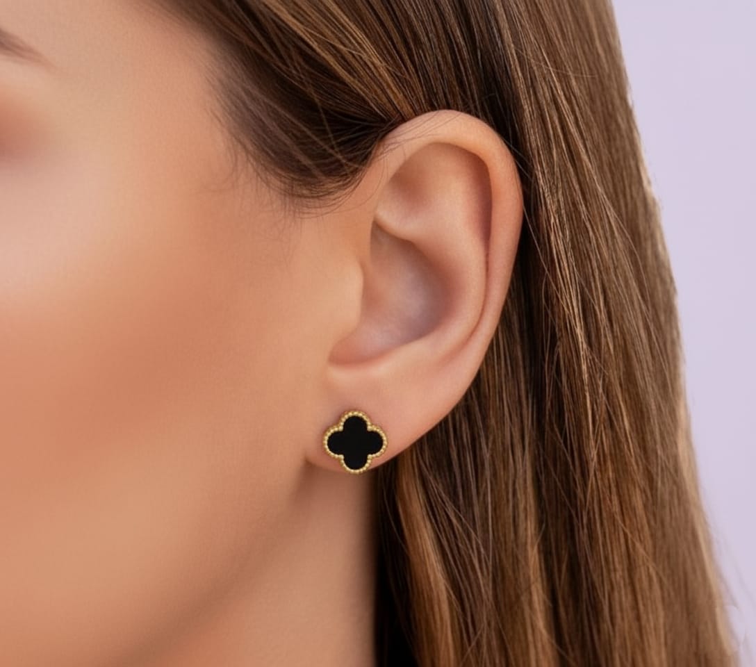 Malachite Clover Stud Earrings, Gold Plated, Classic Design (Black)