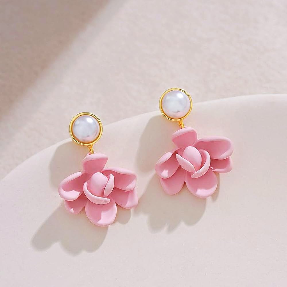 Pearl Flower Drop Earrings For Women, Spring Summer Collection.(Pink)
